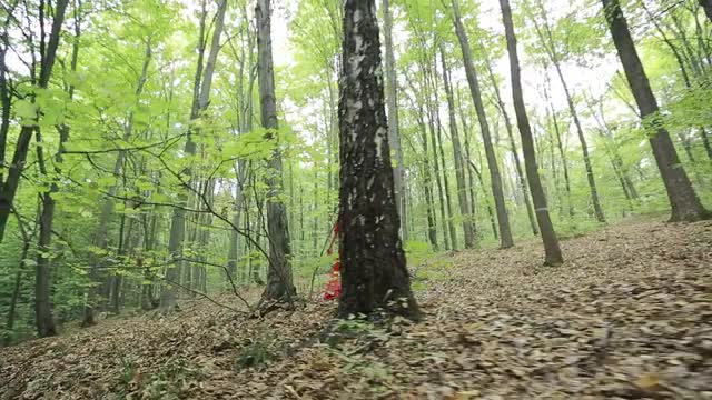 Slow motion shot of a frightened young woman in white dress walk in the woods