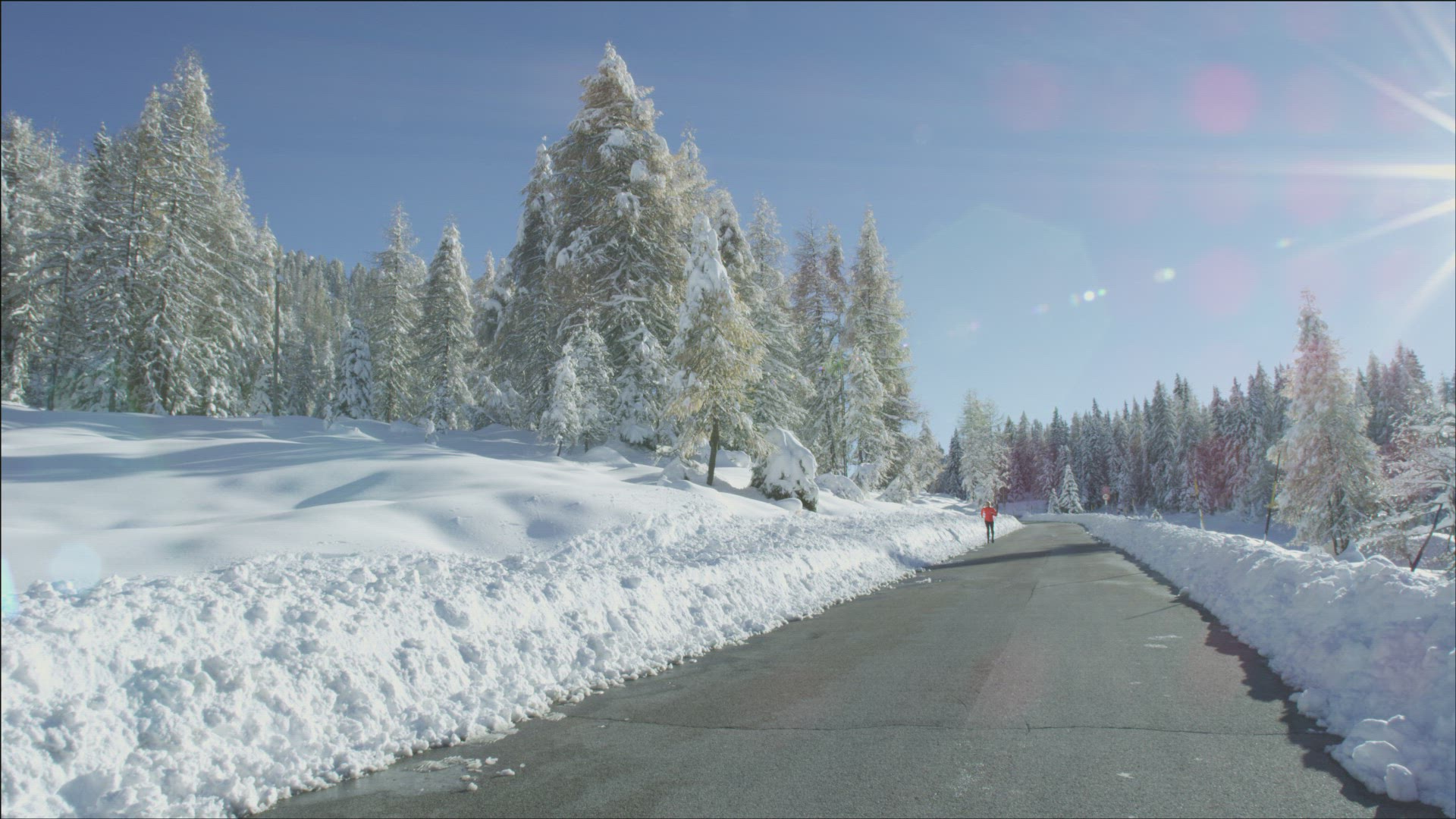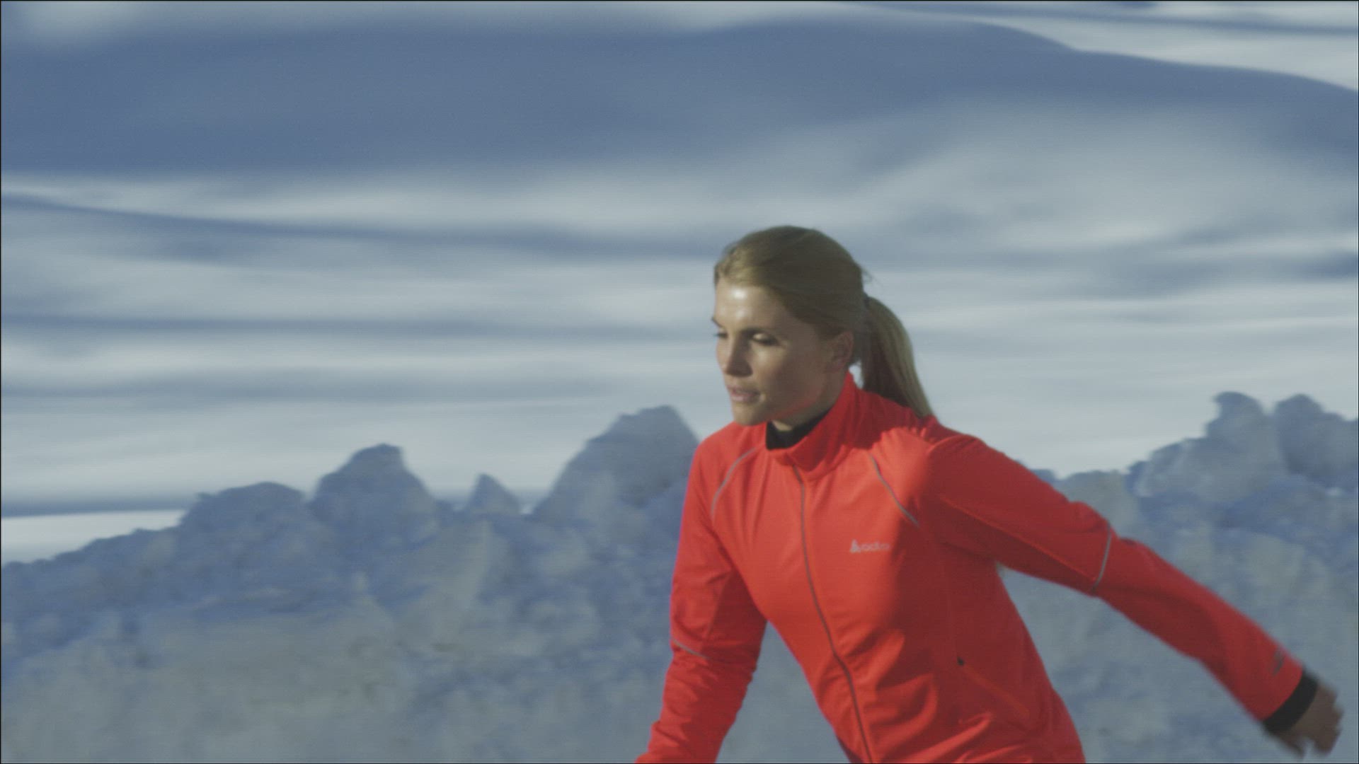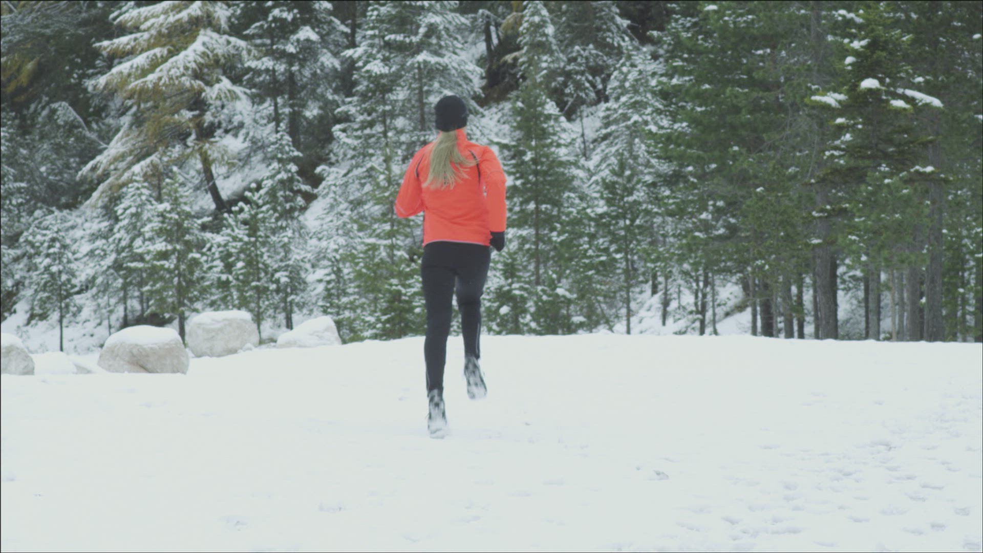 Athlete woman with headphones is running during winter training outside in cold snow weather