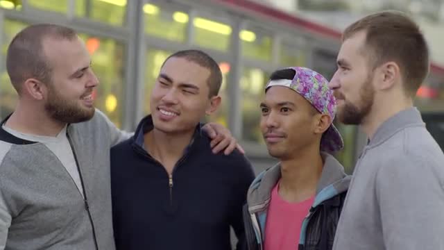 Two Couples Hang Out And Chat In Front Of Bus Stop In The Castro, San Francisco