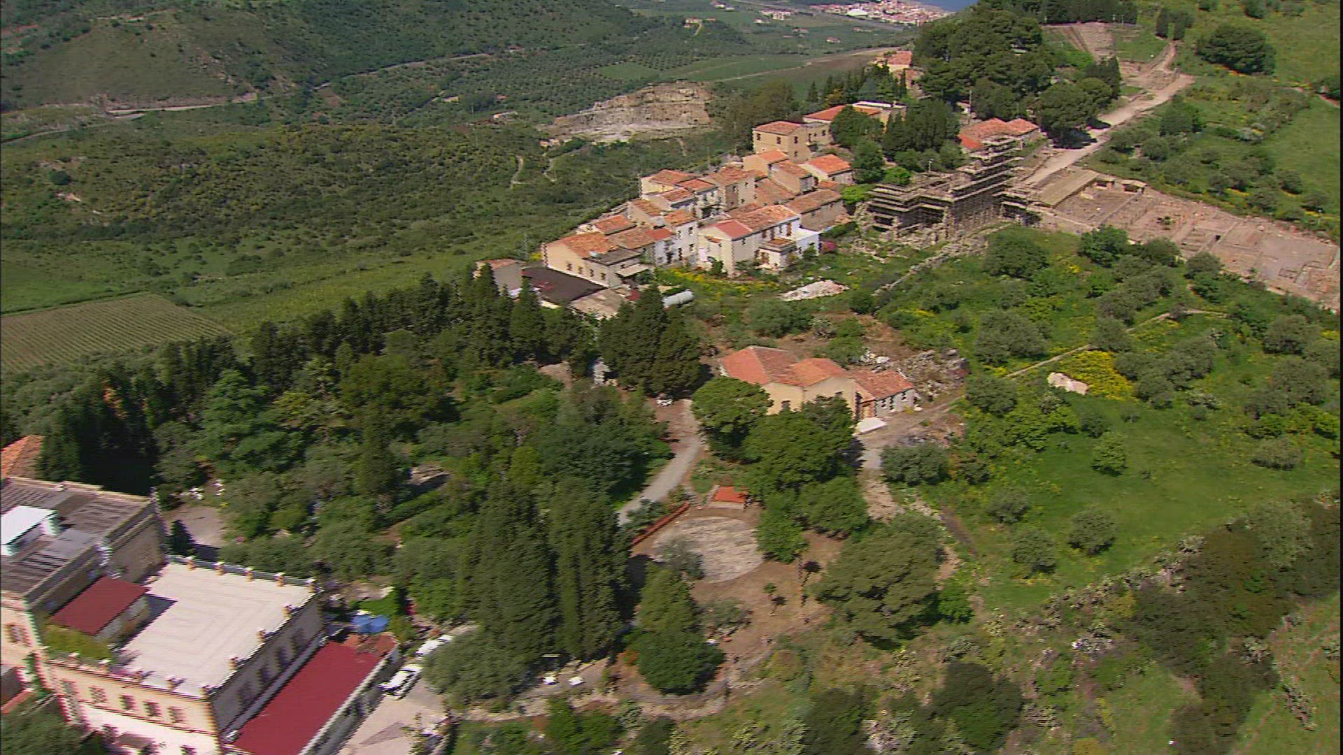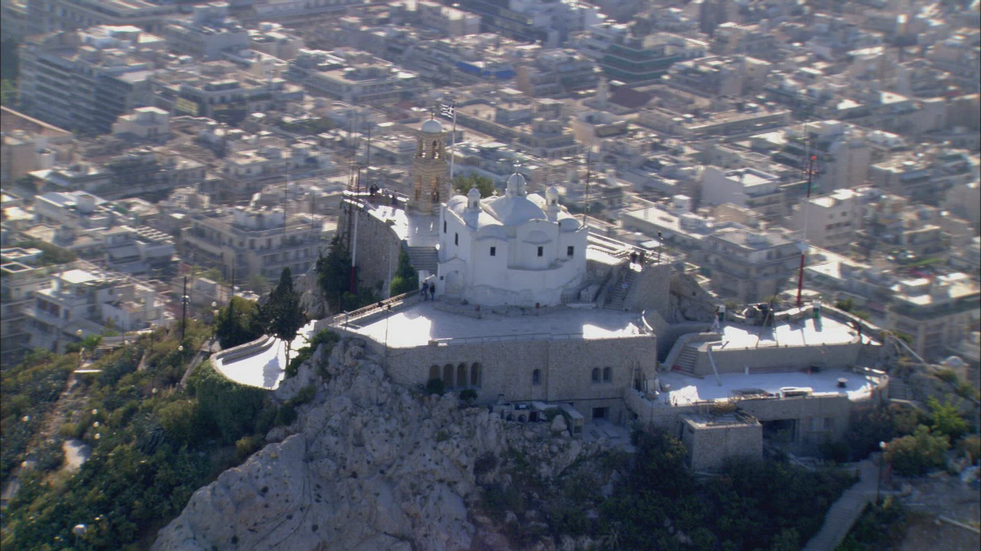 Aerial shot of the beautiful antique church on the island with coastline on the background