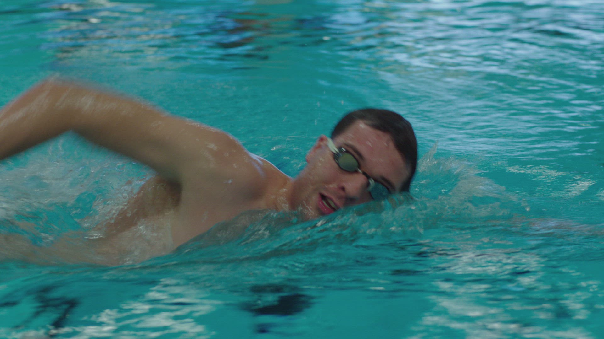 Aerial shot of a male swimmer swimming in the river with forest on the banks
