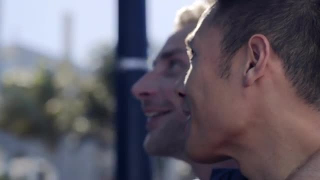 573278 - Gay Couple Lean Against Railing And Chat On Sunny Day In San Francisco