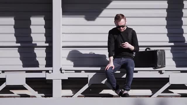 a Man With a Bag and a Backpack Waiting For the Train, and Uses the Smartphone