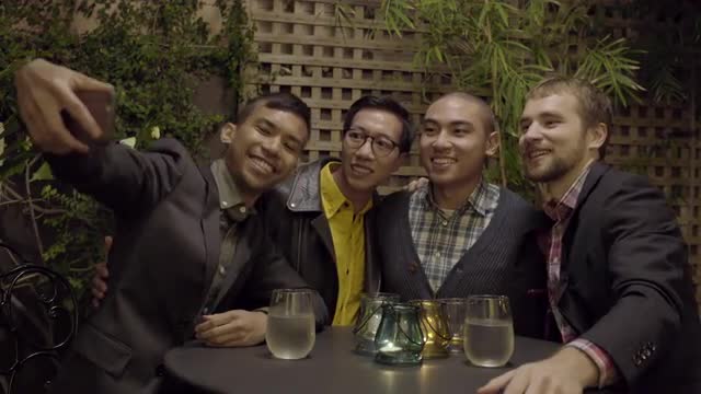 > Attractive Gay Couple Toast/Cheers Drinks For Selfie At An Outdoor Cafe In San Francisco