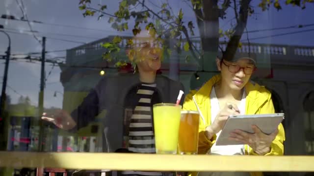 Attractive Gay Couple Toast/Cheers Drinks For Selfie At An Outdoor Cafe In San Francisco