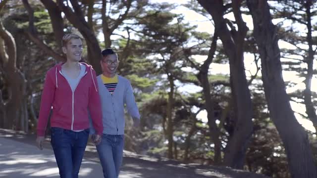 Gay Couple Walk Around Beautiful Fountain In San Francisco