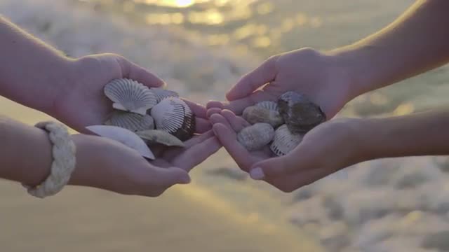 > Teen Girls Run With Gopro Stick On Sandy Beach At Sunset