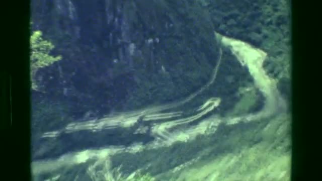 > 1977: Machu Picchu green forested mountains surrounding area river below. CUSCO, PERU