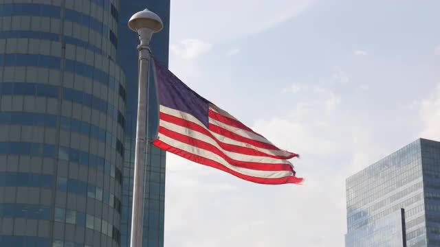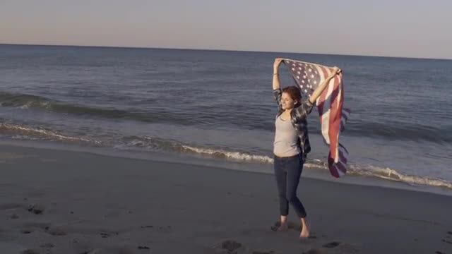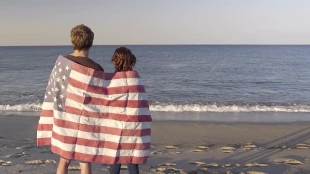 > Teenage Couple Hold American Flag Between Them, They Run Down Beach, Away From Camera
