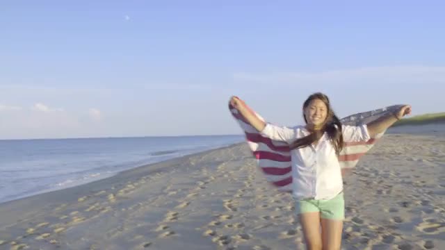 Teenage Couple Hold American Flag Between Them, They Run Down Beach, Away From Camera