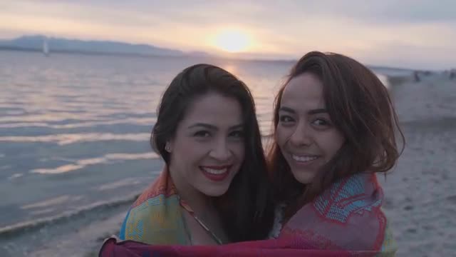 A cute couple of girls converse and observe downtown Seattle, Washington and the Space Needle