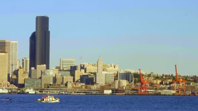 Wide landscape shot of downtown Seattle, pans to follow boat in water in front of buildings