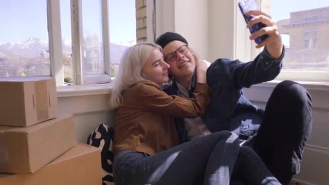 Portrait Of Happy Trendy Couple Sitting Together In Living Room