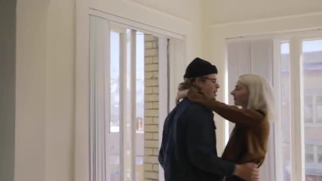 Cute Couple Dance Around Their New Apartment On Moving Day, Cardboard Boxes In Background