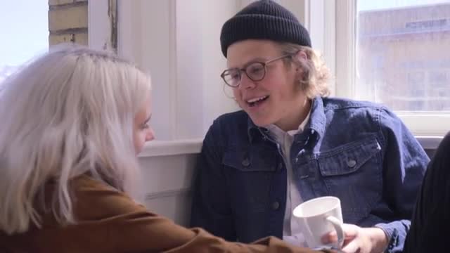 > Cute Couple Drink Their Morning Coffee In Their New Apartment, They Kiss