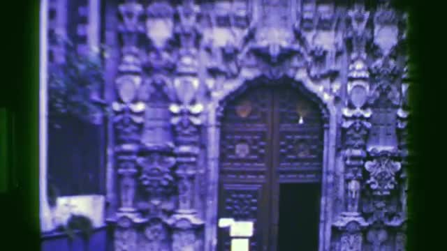 > 1978: Man sweeping cathedral church ornate religious white stone building. MEXICO CITY, MEXICO