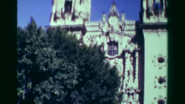 > 1978: Religious church cathedral building tilt down blue sky sunny day. ACAPULCO, MEXICO