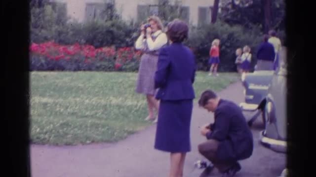 718534 - 1961: woman taking pictures beside cars and other groups of people and children SWITZERLAND