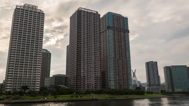 Time-lapse footage of sun filtering through the clouds over Tokyo cityscape before sunset, Tokyo, Ja