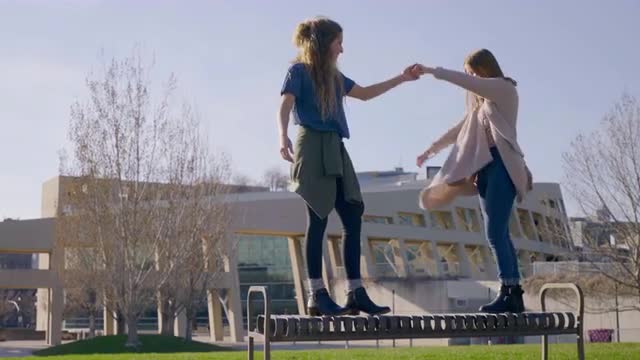 > Teen Girls Listen To Music From Smartphone, And Dance Together On Park Bench