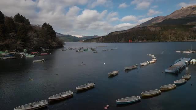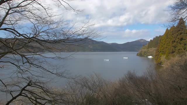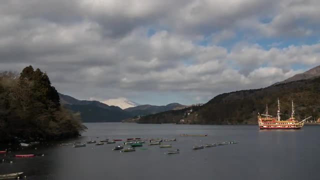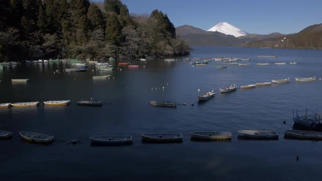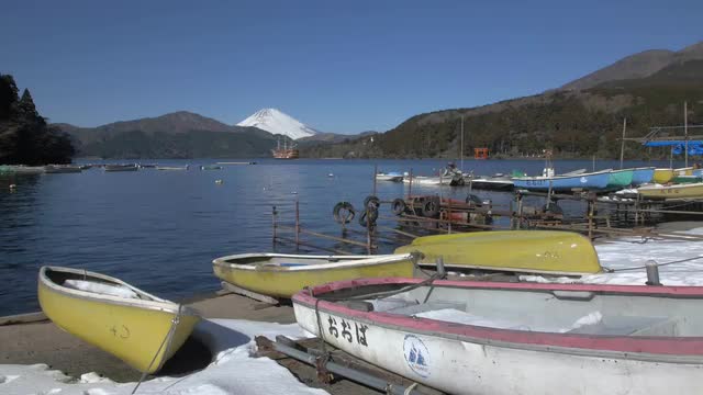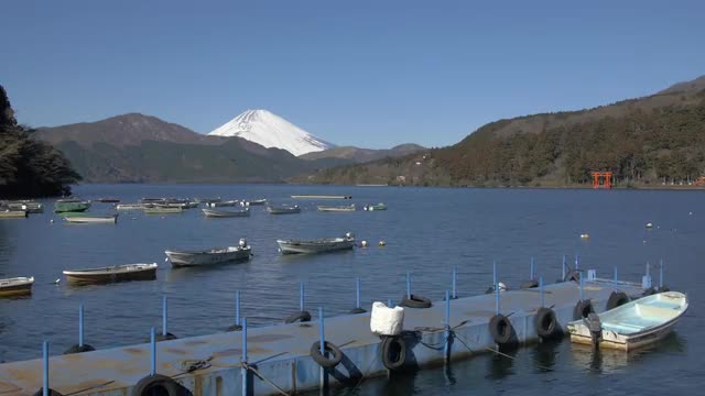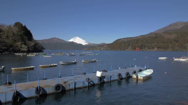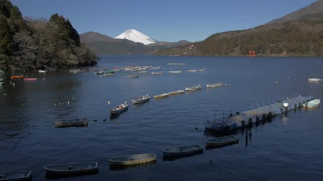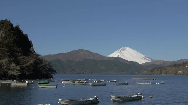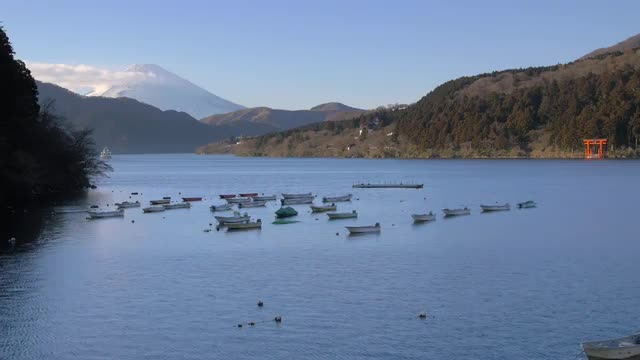 > View of Mount Fuji and boats at Lake Ashi, Kanagawa Prefecture, Japan