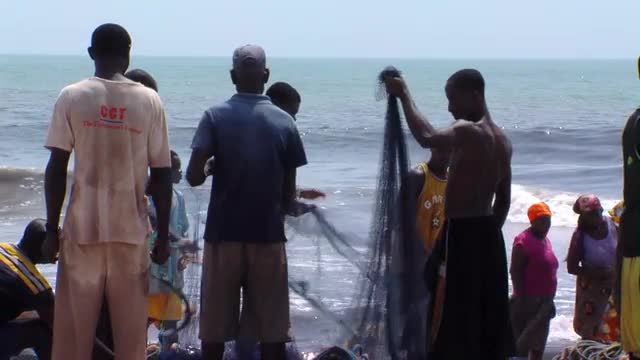 People on a beach with a fishing net in Africa.