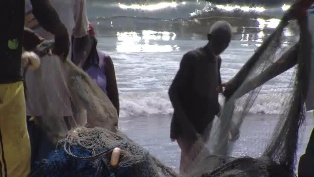 People and a fishing net on a beach in Africa.