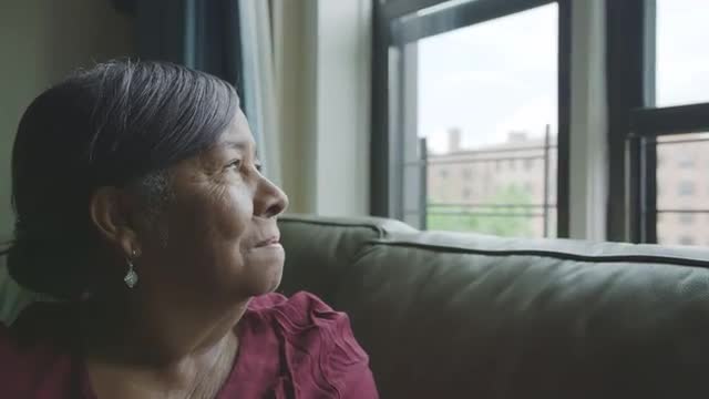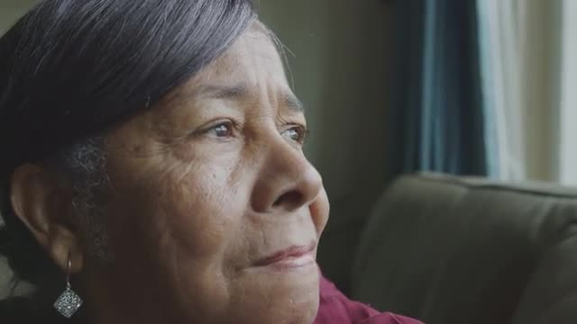 Serious senior man with a white beard and wearing a hat looking out the window