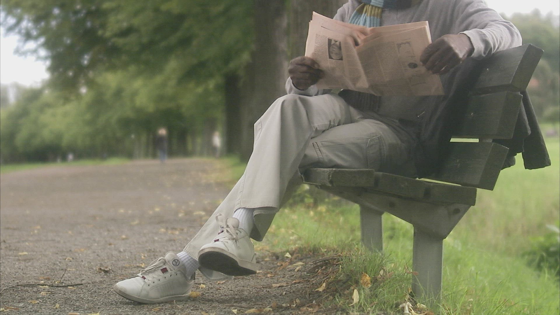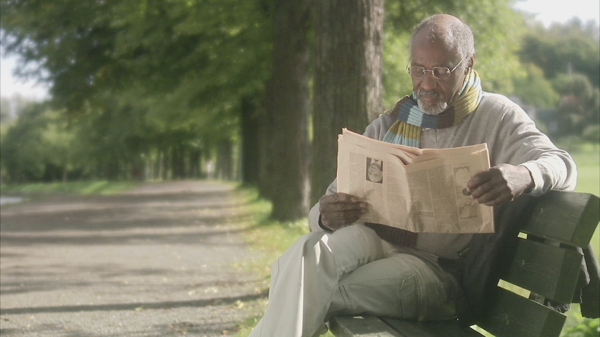 Senior gentleman with hat sitting on a bench and reading a newspaper