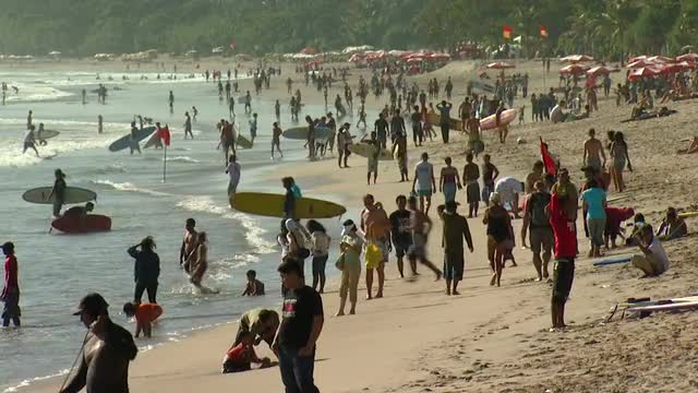 > Crowded beach in Bali.