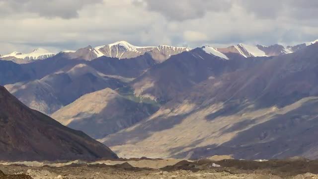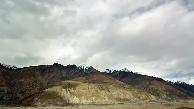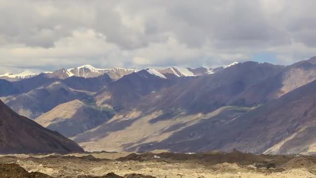 A dutch angle low to the snow dolly time lapse along the wind blown glacial snow with the sun in the back.