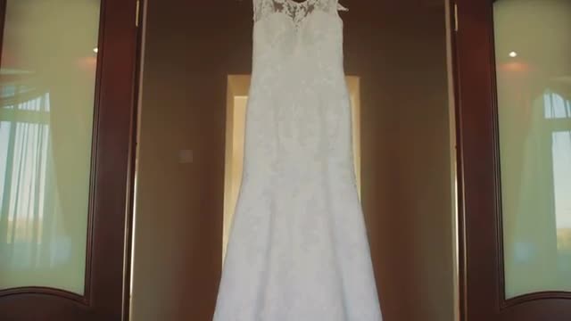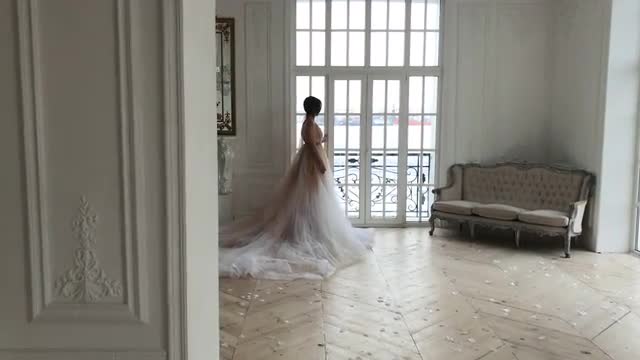 Beautiful happy bride in a wedding dress near the stairs in luxury hotel hall