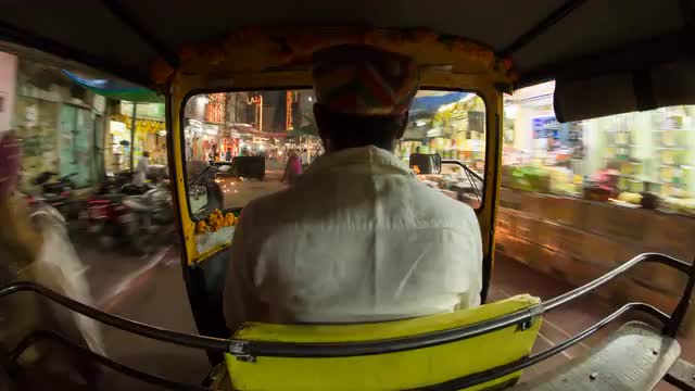 > Autorickshaw POV busy illuminated old city streets, Udaipur, Rajasthan, India - 4K timelapse