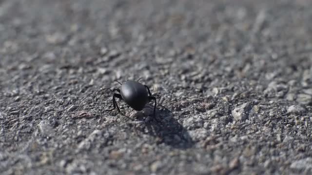 4K Macro shot of a small black beetle walk on the gray asphalt