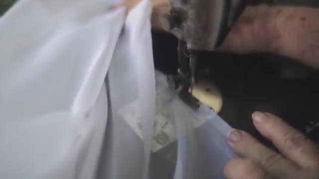 Close up shot oa a old female hands sewn white tulle on old sewing machine
