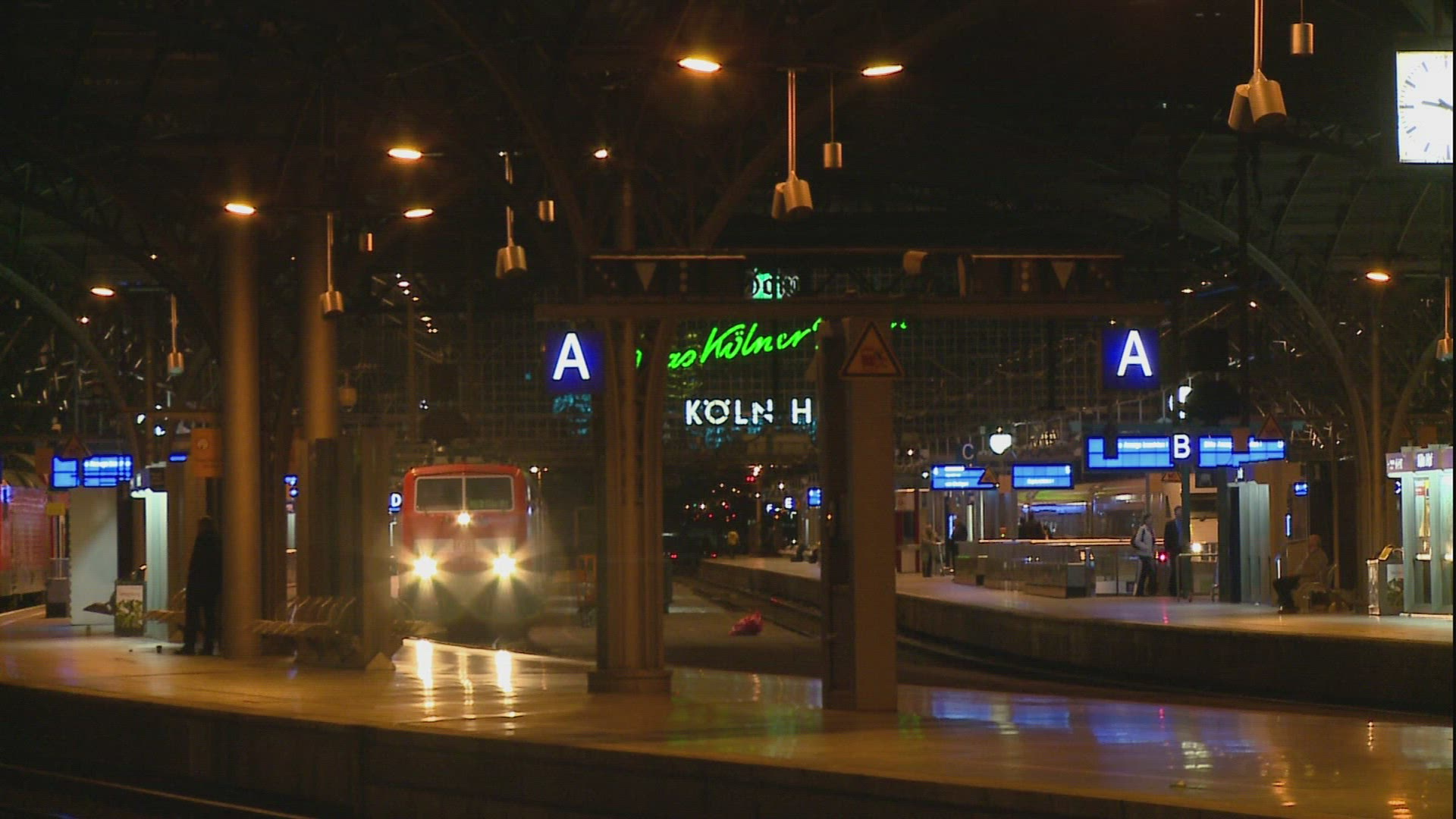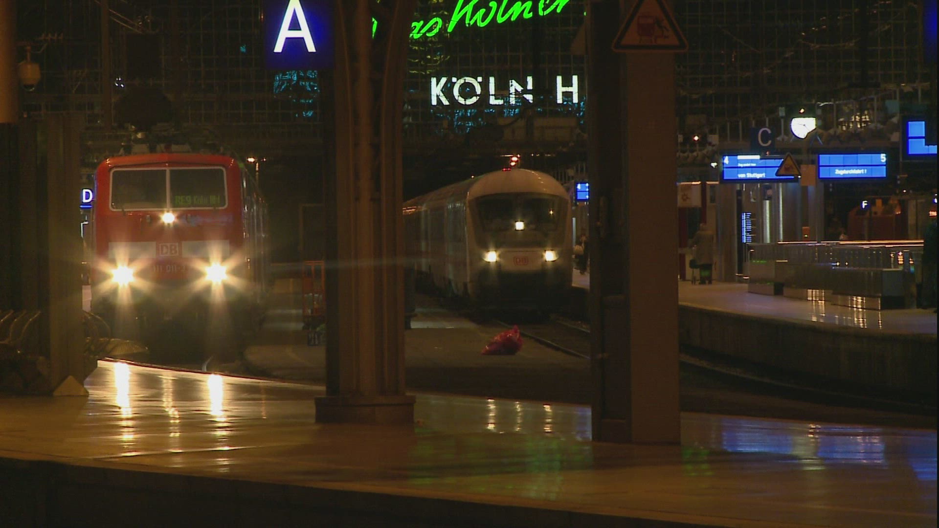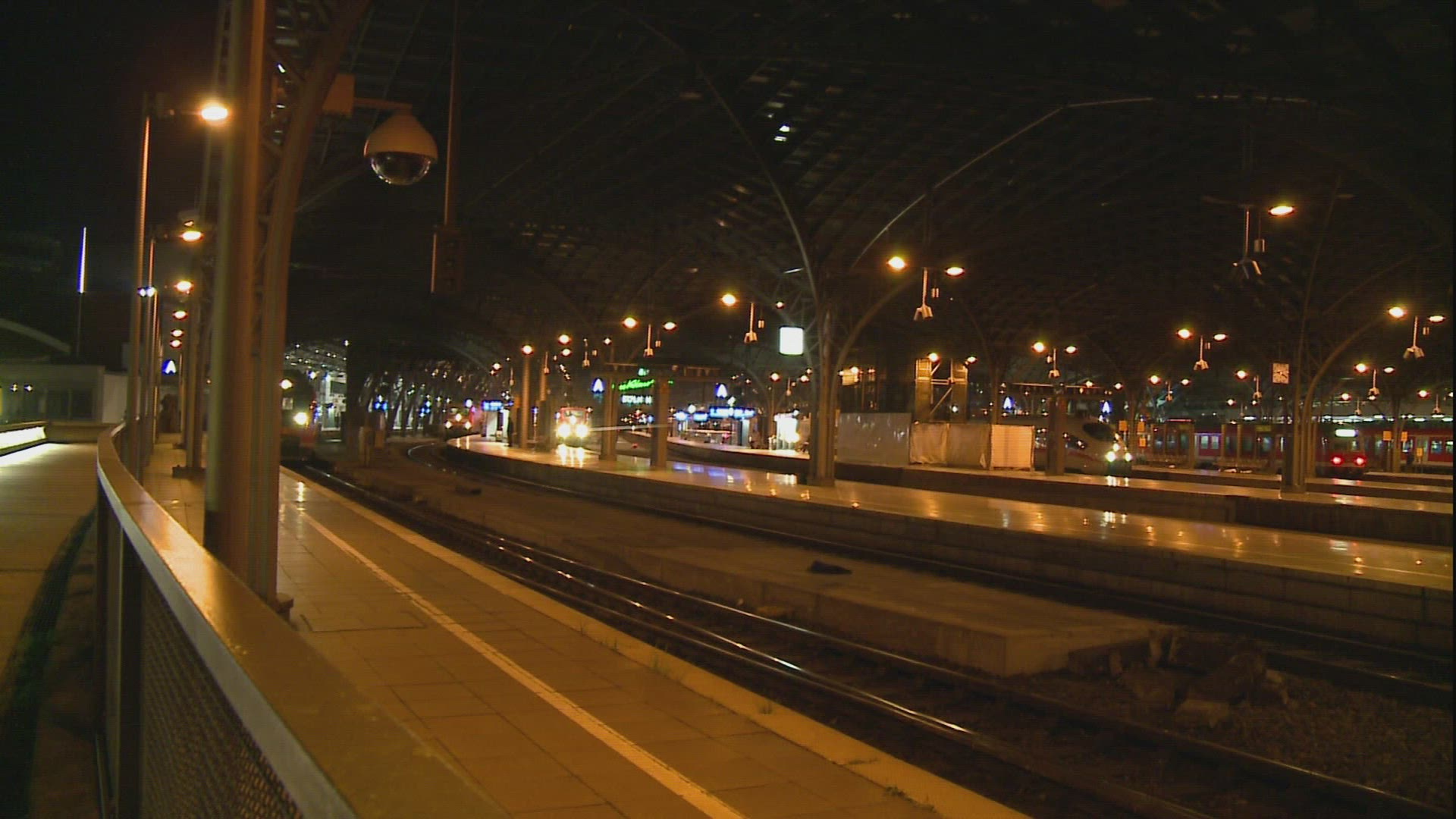 Railway station with a variety of ways and trains. Woman in uniform walking along the platform