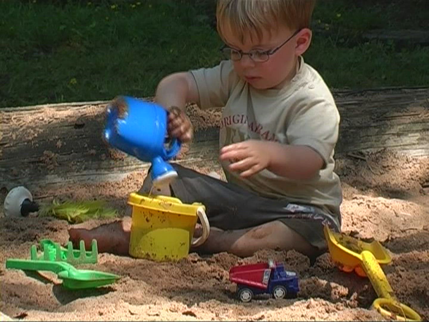 Top view to a male hands with sand poured through his fingers. Beautiful bokeh in the background.