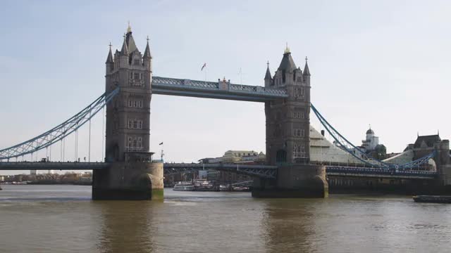 > Wide shot of the Tower Bridge in London.