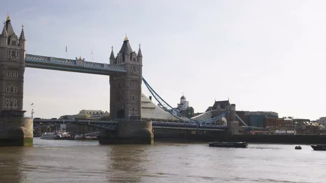 > Wide shot pan of the Tower Bridge in London.