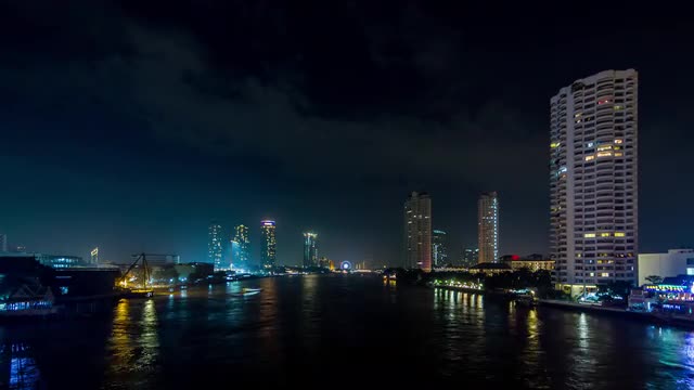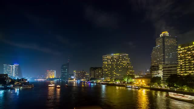 483953 - Night timelapse of Chao Phraya river with modern hotels in Bangkok, Thailand