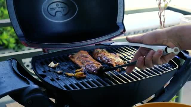 Barbecue skewers with meat cooking on the grill outdoors with smoke. Closeup detailed shot. 4K UHD video footage.