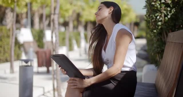 Young Happy Businesswoman in Black Sitting at a Table in a Cafe, She Typing on Touchpad.