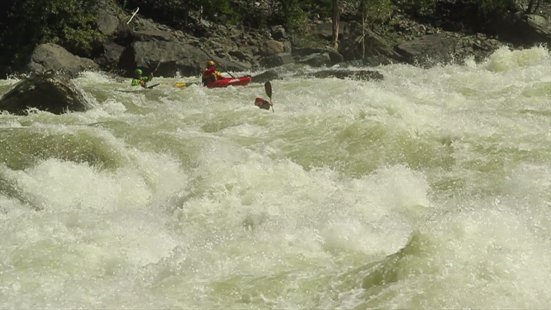 Close up of a recreational white water kayaker, on a river in Colorado.