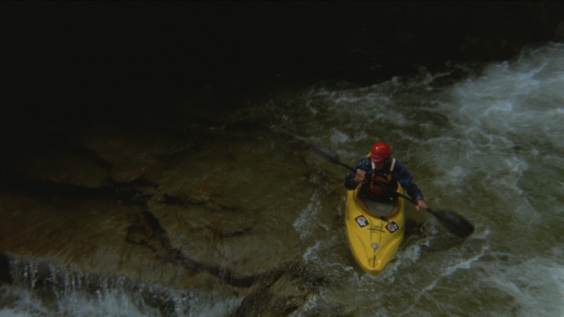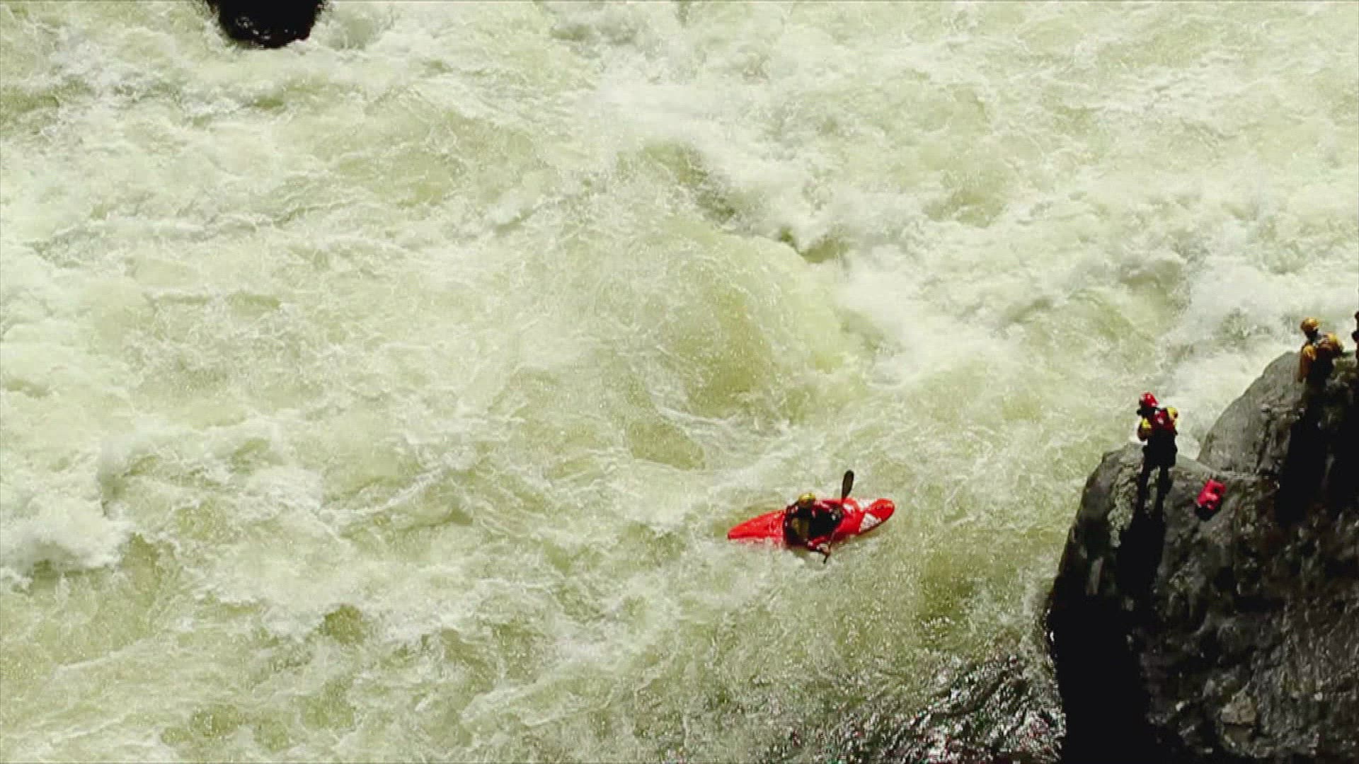 775565 - Drone Following Extreme Athlete in Kayak Paddling Waves of White Water Rapids in Slow Motion