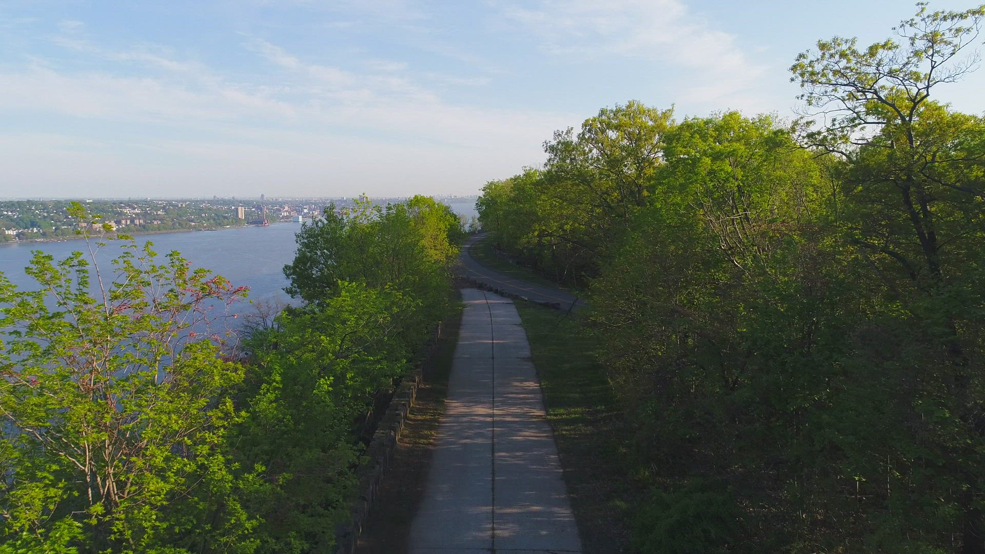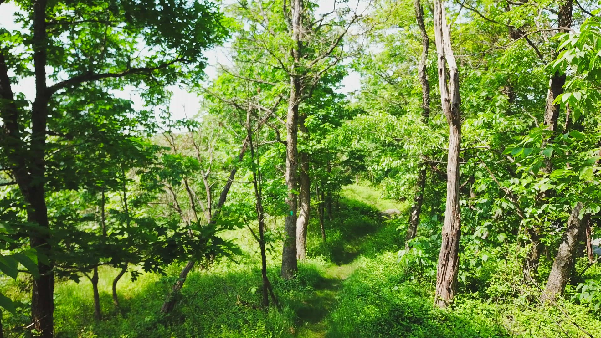 Aerial shot of three mountain bikers riding single track through the woods in Colorado.