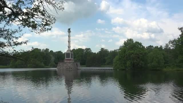 > Tilt up shot of the Albert Memorial in Kensington Gardens, London.