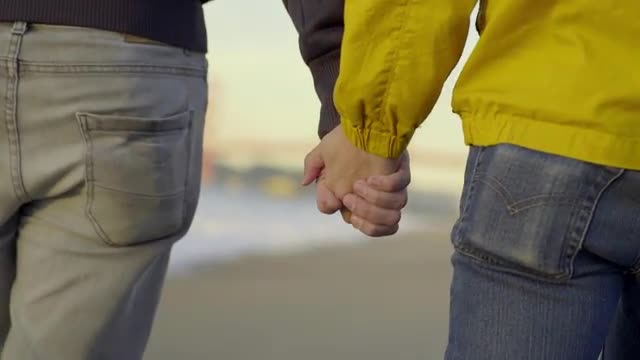 Gay Couple Hold Hands And Walk Down Beach Toward Golden Gate Bridge (Slow Motion)