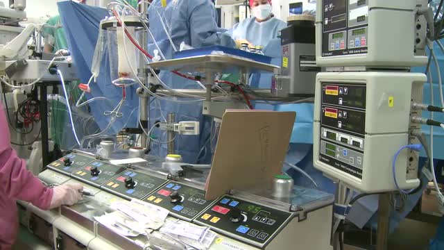 > Heart lung bypass machine with surgical team in background