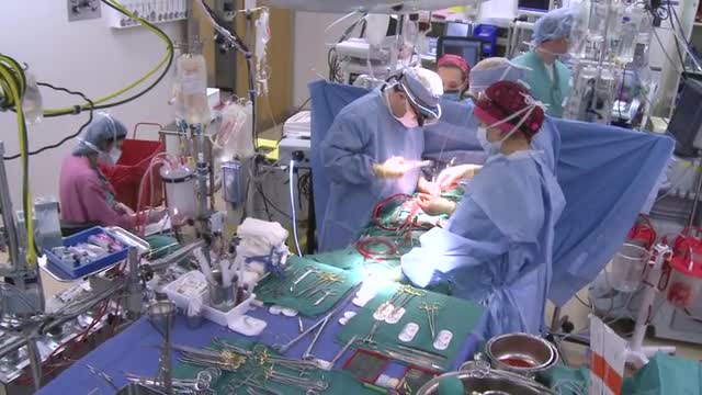 584190 - High shot of surgical team during open heart surgery