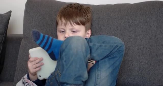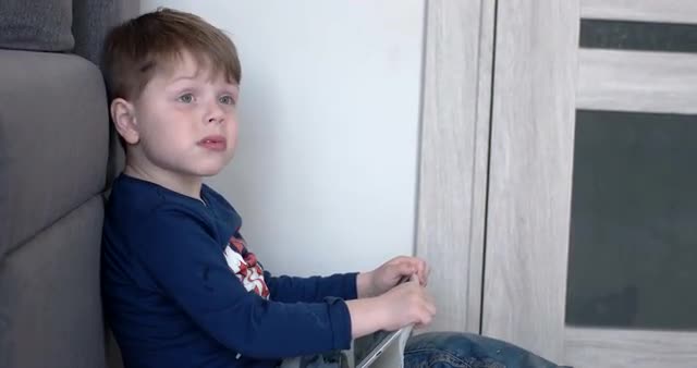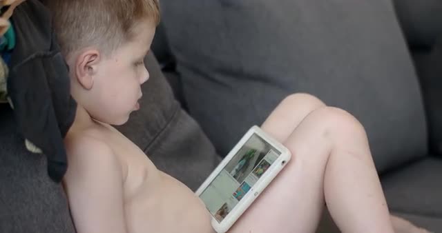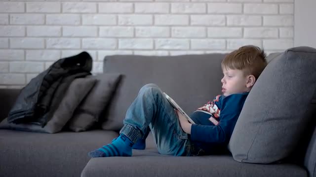 Young Boy Watching Cartoons on a Tablet Computer Sitting on the Couch